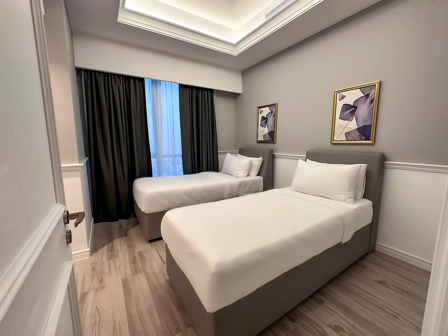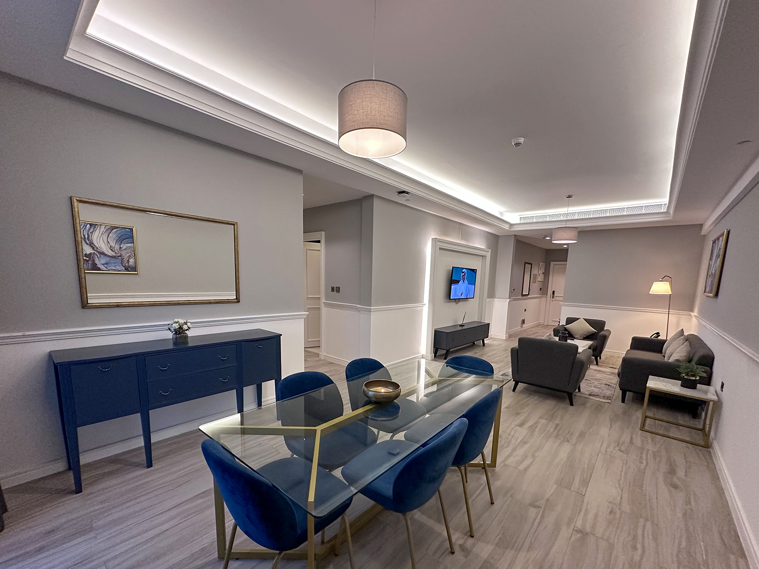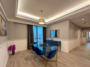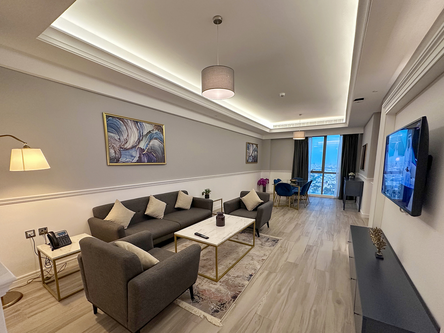 This luxurious fully furnished and equipped apartment contains two spacious bedrooms and three bathrooms, making it ideal for large families or individuals seeking extra space. The closed kitchen is elegantly designed and offers perfect privacy. The interior spaces between the living room and dining area complement each other, making this apartment a comfortable and luxurious choice at Bin Al Sheikh Towers. Bin Al Sheikh Towers are strategically located for easy access to the city’s top amenities and shopping centers. The towers also provide comprehensive comfort facilities, including a swimming pool, a fully equipped gym, 24/7 security services, and secure parking. Don’t miss the opportunity to live in this unique location that combines luxury and convenience—visit your future apartment today!